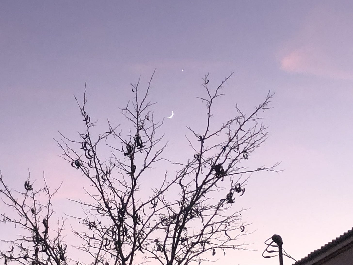 As we left the saloon and headed southeast on E. Allen Street, something in the sky caught my eye. It was a very dim crescent moon in the early sunset. As I turned to look closer I realized that two planets were also in the soft pink eastern sky. Jupiter and Venus were in conjunction with the moon.