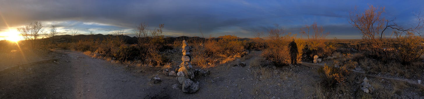 I woke up the next morning and went out to explore the very symmetrical mound just south of the hotel. Perfectly symmetrical I figure it is a tailings dump site for a mine. It was a bit of a hike up the side of the hill, stepping over sage brush, fresh rabbit droppings and wondering if there might be a rattlesnake lying in wait for the rabbit. This mound, the “Comstock Hill” as it is known gives one a spectacular 360 degree view of Tombstone and the vast desert surrounding the town. Once at the summit I realized there was an open trail to the top from the south. Also manmade stacks of rocks that I imagine indicate a ritual or two being performed in this unique, perhaps holy to someone, environment.