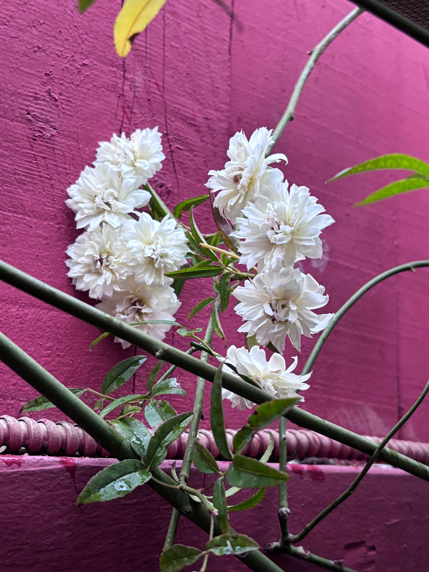 Our Tombstone Rose resides in a patio are we call ”The Jungle”, an enclosed are with a palm tree, lounge chairs and other potted plants. We are looking forward to many more April blooms of this durable, adaptable rose.